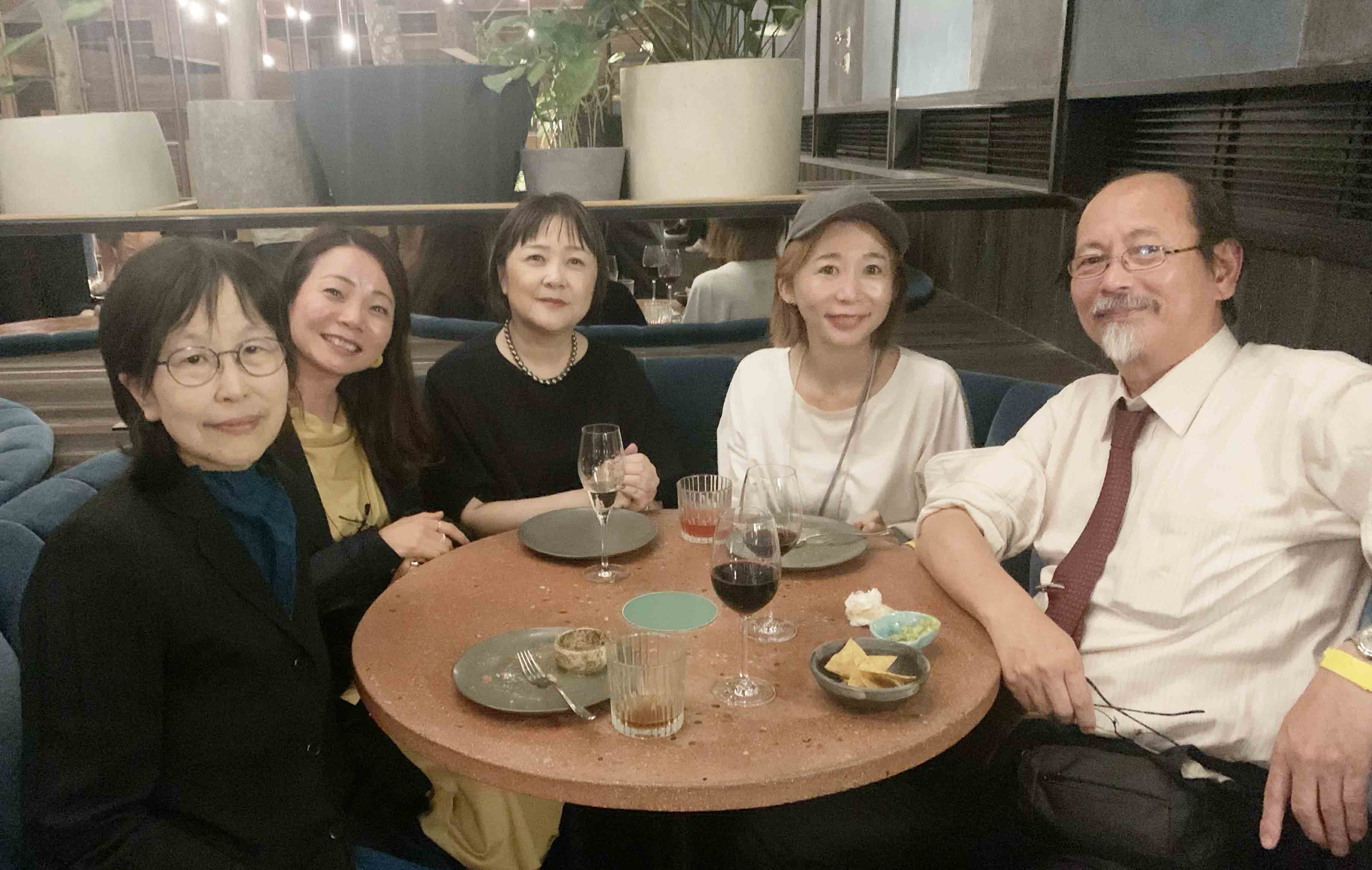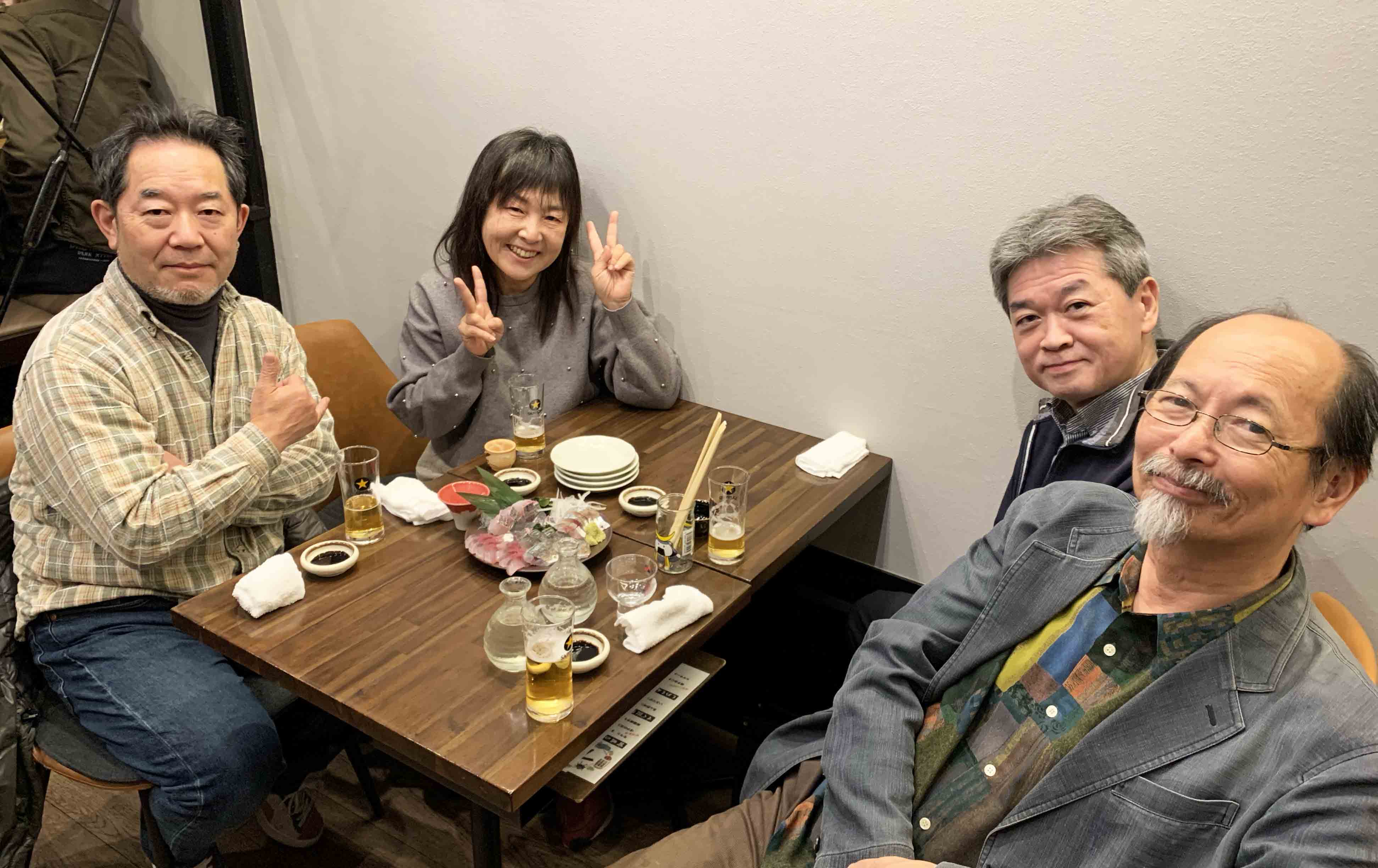 練習が終わった後、くうかいで会食。この時間が楽しい。向かって左から、大久保博志氏(Progress)、幸谷愛先生(大阪大学)、縣保年先生(滋賀医科大学)、私。 |