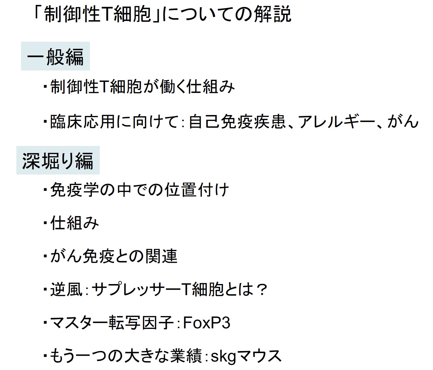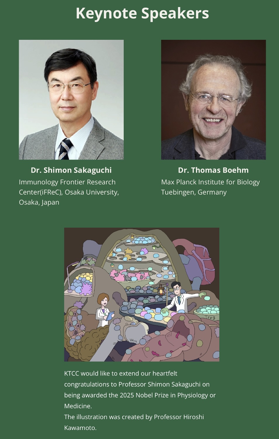 キーノートスピーカーは、坂口志文先生と、トーマス・ベーム先生。私は毎回、KTCC用にイラストを描いているが、今回は、坂口先生のノーベル賞受賞にちなんだイラストにした。その関係で、トップページではなく、キーノートスピーカー欄に埋め込む形になった。 |