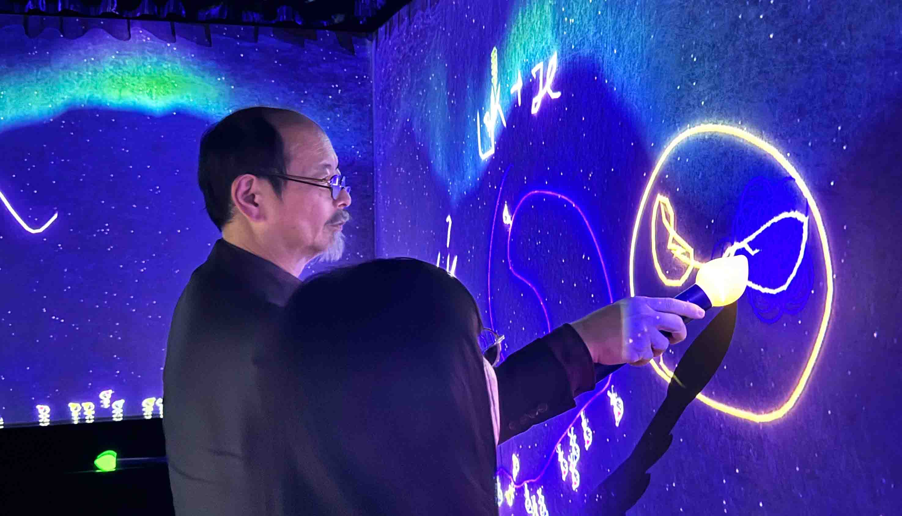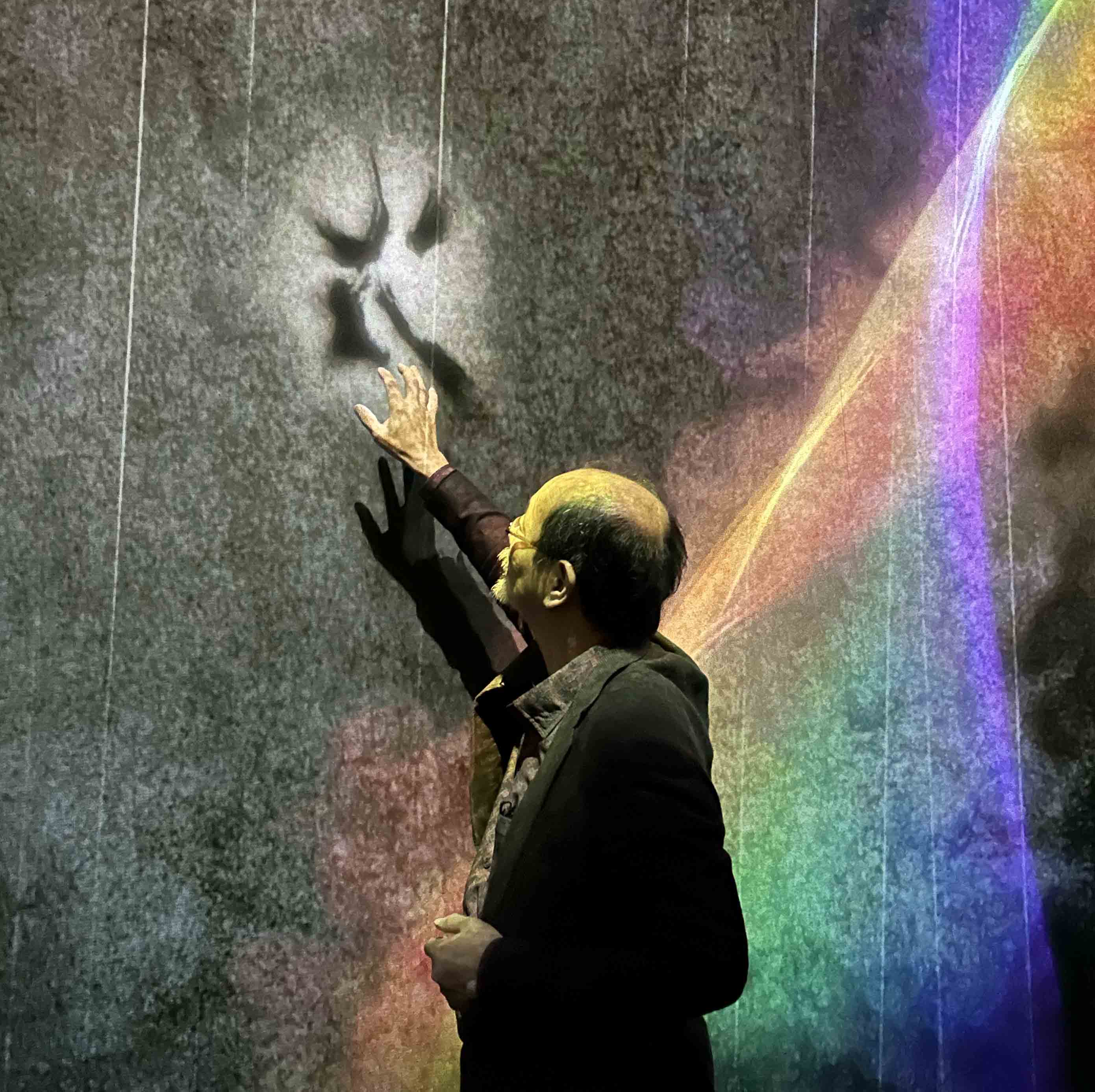 上からゆっくり降りてくる文字に触れると、映像が現れる。雷、蛍、虹など。 |