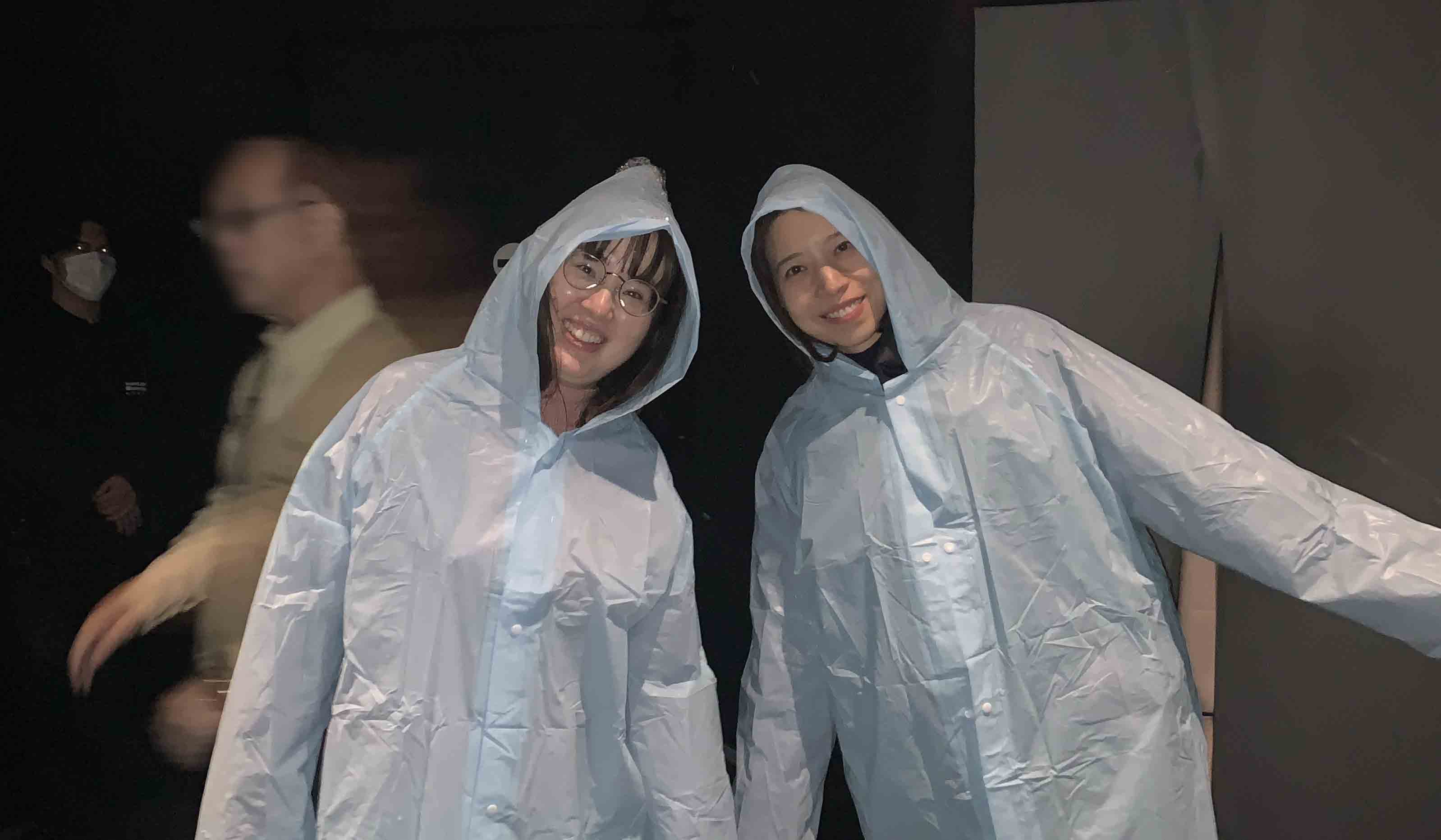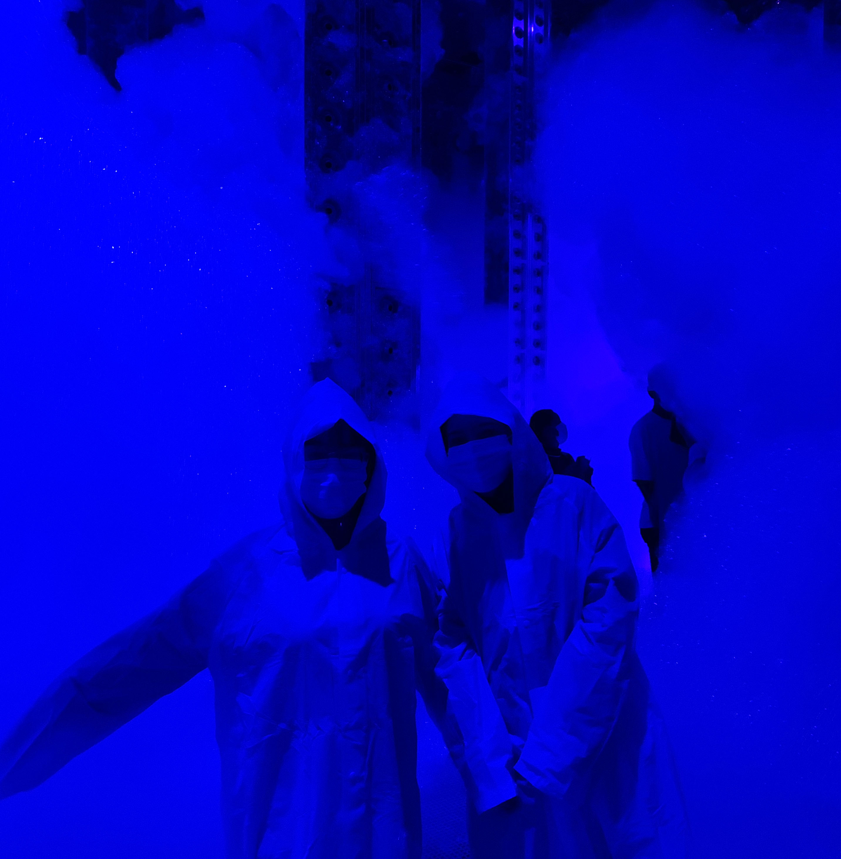 泡が渦巻いている部屋では、300円かかるが、こういう服を着て、マスクも着けると、泡の中に突っ込んでいける。 |