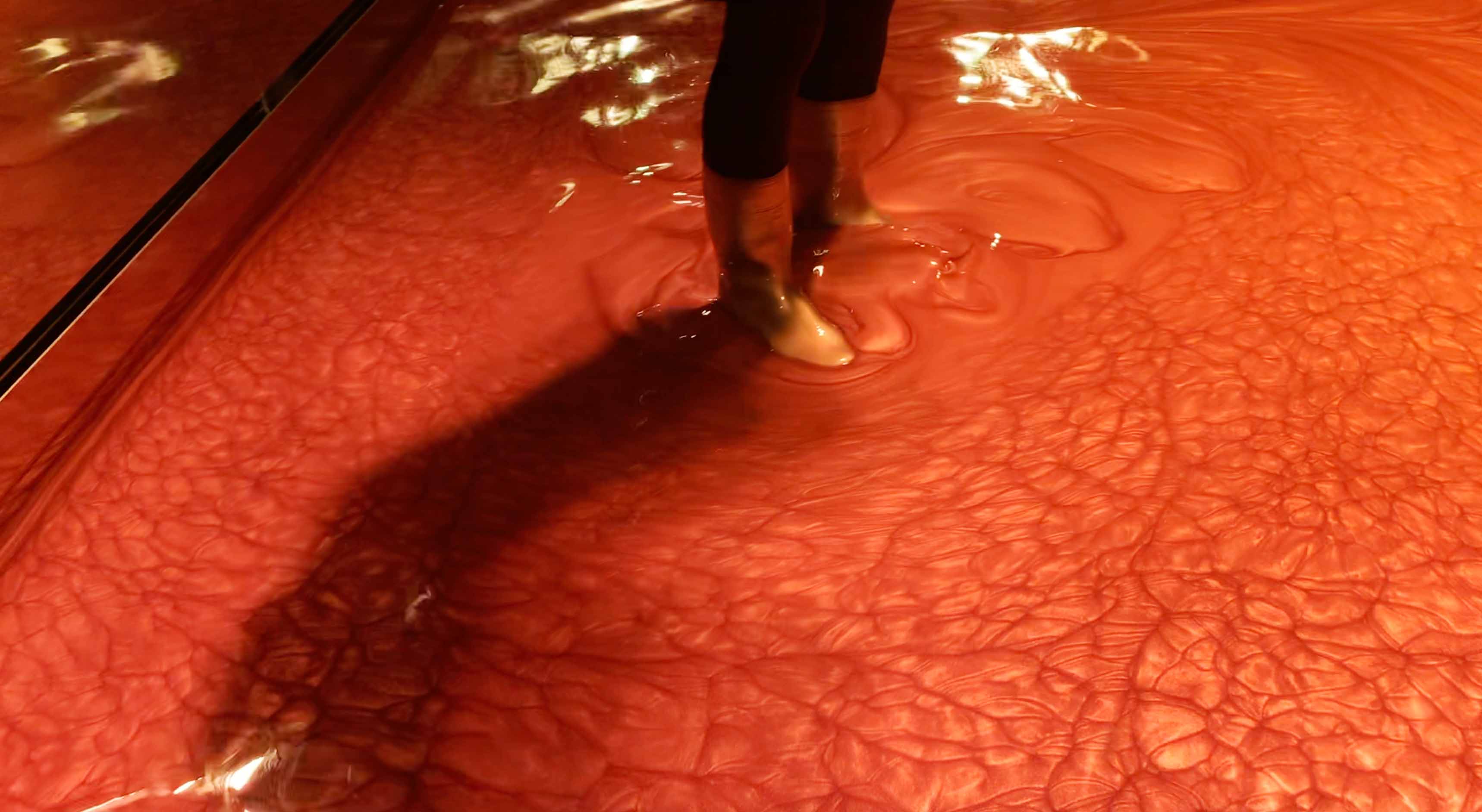 かき回しても、すぐにボコボコした対流模様が現れる。 |