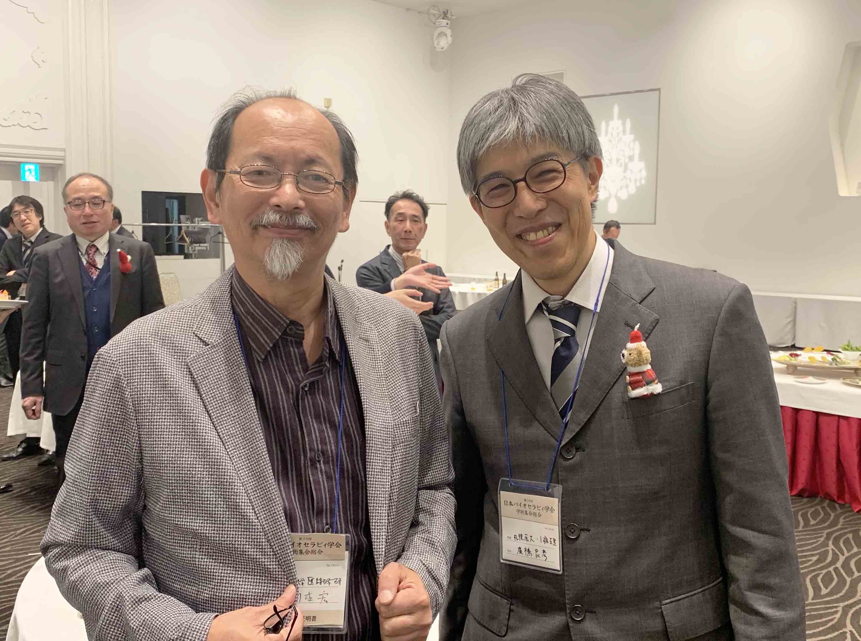 濱西潤三先生(京都医療センター産婦人科診療科長)と。少し前まで京大病院の産科婦人科におられていて、AMEDの先端バイオ創薬(2019-2023年度)では卵巣がんの腫瘍浸潤T細胞のシングルセル解析などの共同研究をご一緒した。今回、この学会の理事に就任された。 |