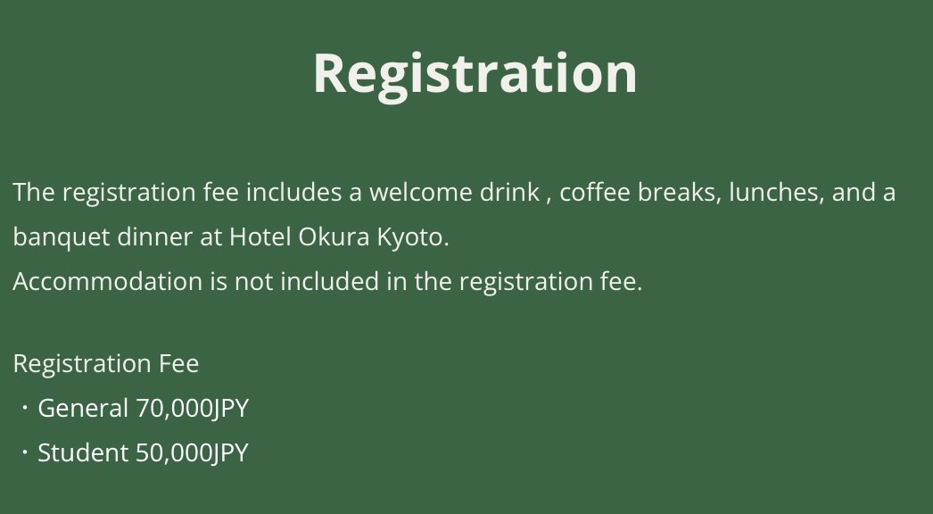 今回は、運営方針が大きく変わり、参加費を、海外の学会に合わせた額にしようという事になり、一人7万円、学生5万円という設定になった。これまでは国際KTCCは2万円くらい設定だったと思うが、これは格安で、集会長は協賛金集めなどをかなり頑張ってする必要があった。今回のようにすれば、集会長は特にお金集めに必死にならなくても、何とかなるはずだ。それにしても、一人7万円となると、ラボメンバーにも、気軽に「参加したい人はどうぞ、全額支援しますよ」と言えなくなる。 |