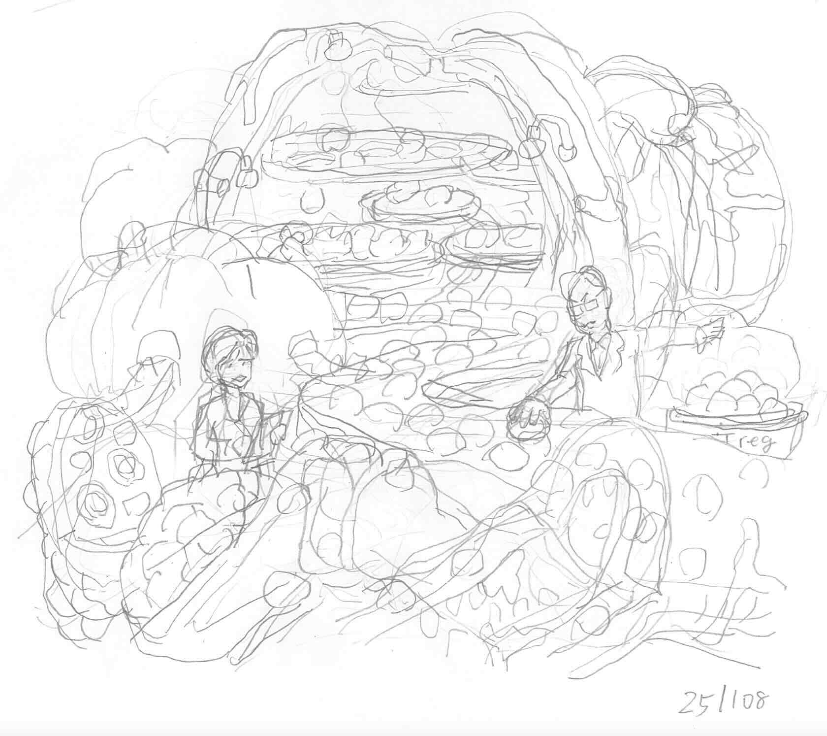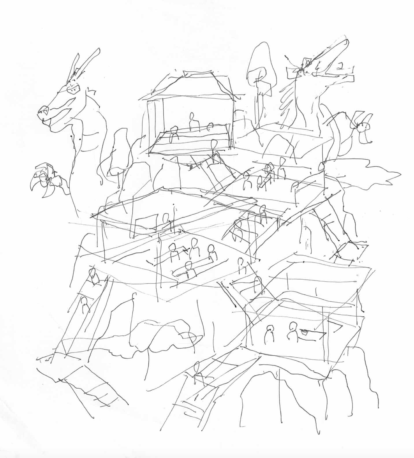 元の構想では、左のように、「延暦寺、修行僧、竜」というイメージで、胸腺の中の正と負の選択過程を、修行で昇進あるいは脱落していく若い僧侶、という感じで表そうと思っていた。昨年観た村上隆の影響が少し出ている(2024年8月14日の記事参照)。部屋が何層も重なる様子には、鬼滅の刃の「無限城」のイメージを使おうかと考え始めていたところだった。 |