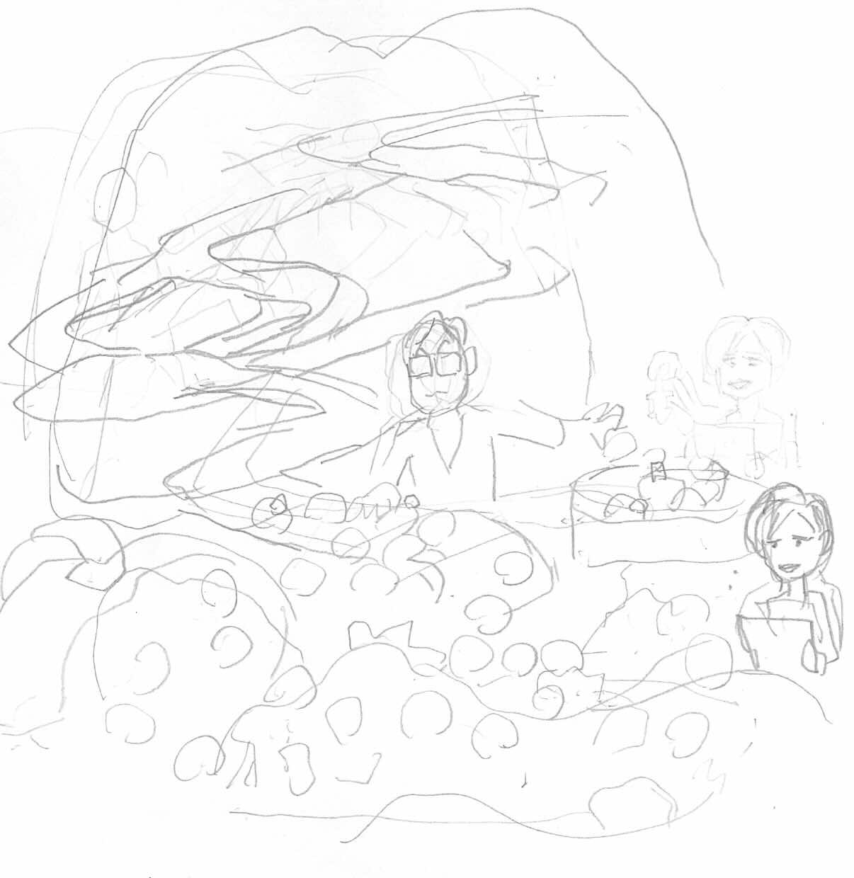 焼きそばを1時間くらいで5ラウンド作り終わり、ほっこりしているテーブル。1ラウンドで3人前を作っているが、それを6人くらいに配っているので、30人分くらい作ったことになる。もう一つのテーブルでも同じくらい作ったので、焼きそば班としては、合計60人分くらい作ったことになる。 |