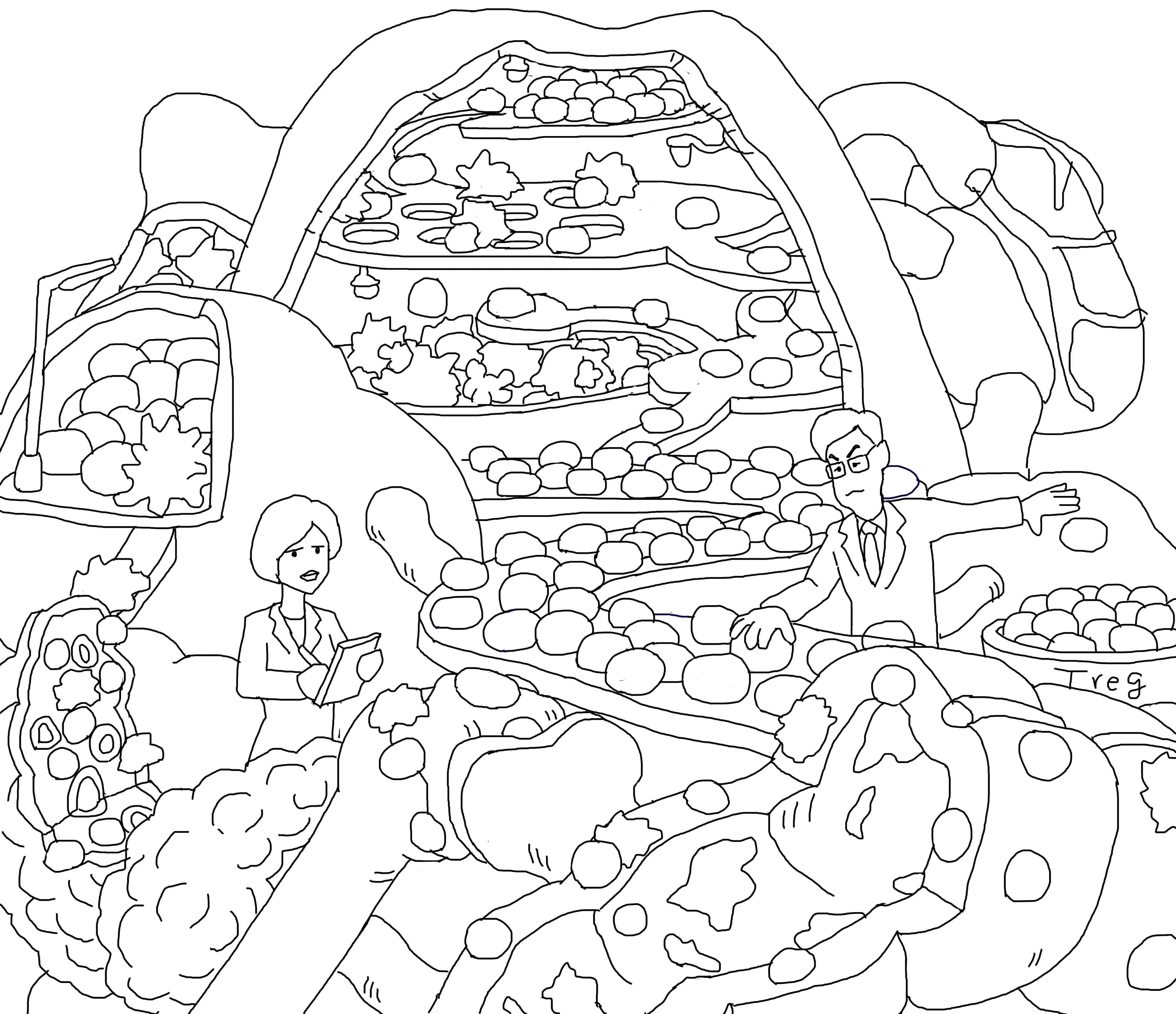彩色。坂口先生は、免疫学会サマースクールで、「街灯の下で鍵を探す」という例え話をされた事があった(と思う)。暗いところで鍵を落としたかもしれないのに、探しやすいからといって明るいところだけを探していては、見つからない。答えに辿り着くには、光があたってないところを探す事も大事、という教えだ。このイラストでは、暗い中、坂口先生がランプを灯して、こつこつとTregを取り分ける様子を描いている。奥様である坂口教子先生は、ご主人の研究を支援しつつも、skgマウスという関節リウマチを自然発症するマウスの系統を樹立され、そのマウスの解析から、胸腺での負の選択が関与する仕組みの発見もされた(Nature, 2003)。なので、教子先生が関節炎を注意深く観察されている様子も、絵の中に組み込んだ。 |