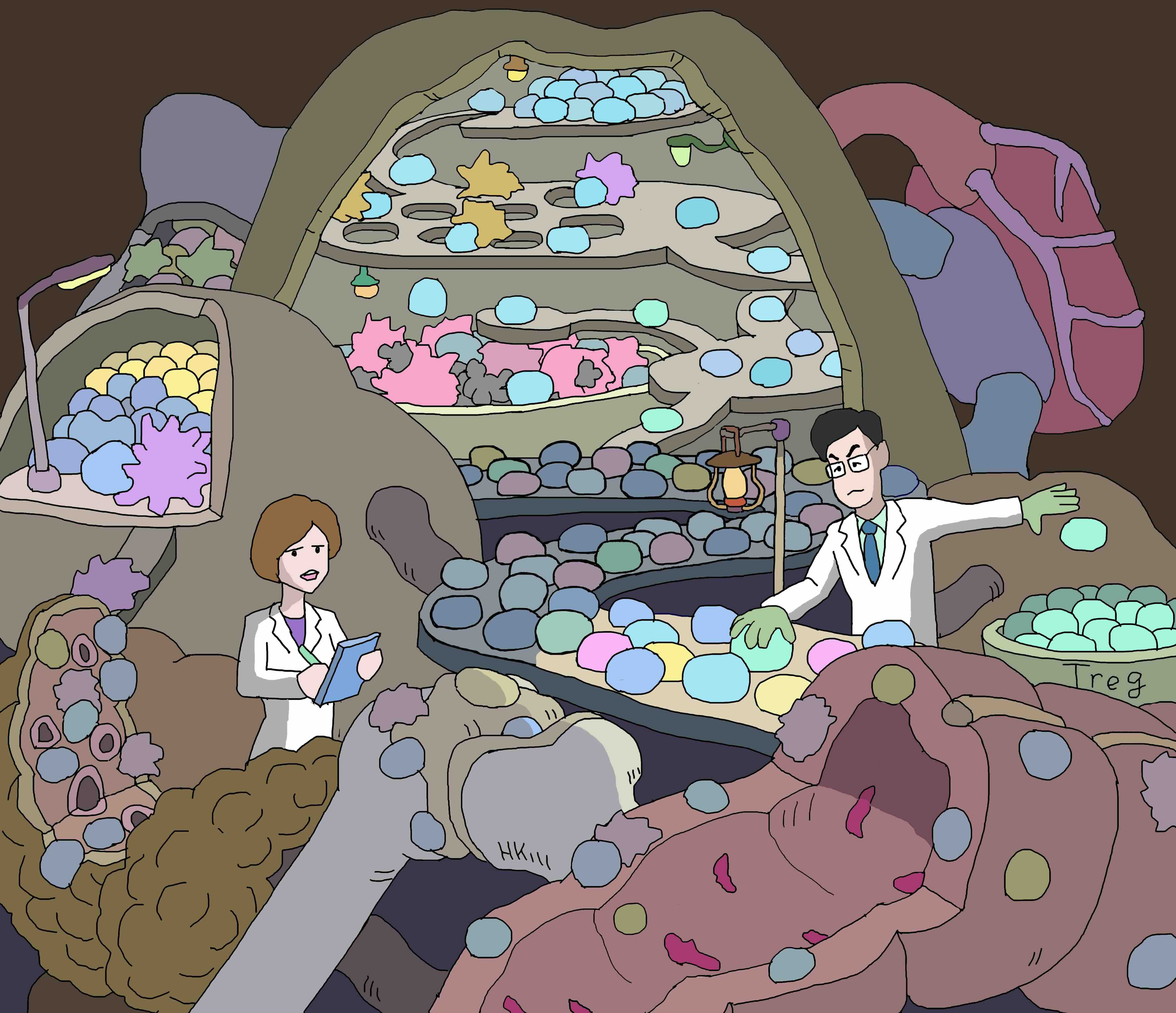 構図は似てしまうが、色の雰囲気を変えたりしようということで、奥に胸腺、手前の末梢では血流中から坂口先生がTregを抜き出して、残された細胞がさらに手前の組織に浸潤して炎症を起こしている、という図案にした。 |