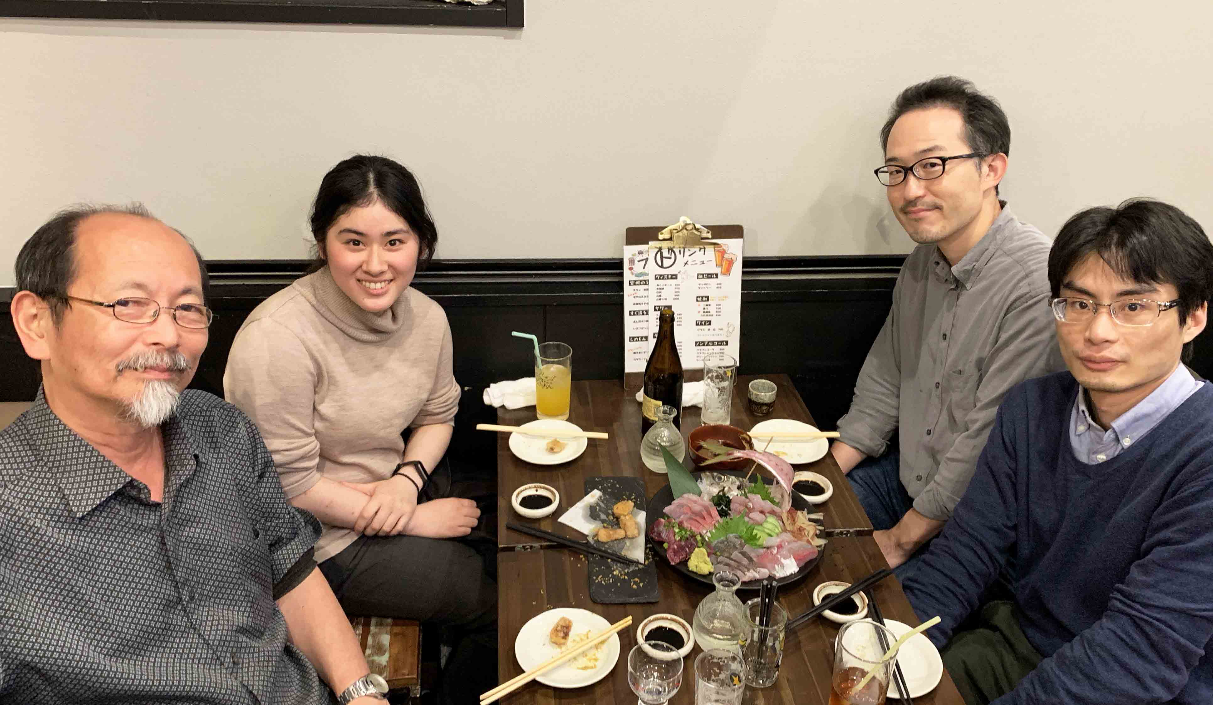 和田森麻悠さんは、ニュージーランドのオタゴ大学 (University of Otago) 医学部の2年生で、11月10日から12 月下旬まで河本研で研修。麻悠さんは、和田森由紀子さん(東大柳井秀元研大学院生)のご令嬢。由紀子さんは今年のIC2NEMOの会(2025年1月28日の記事参照)、昨年の免疫学会(2024年12月3日の記事参照)、サマースクールなどに参加されていた。この日、永野君と西村君も加わって、「くうかい」でプチ歓迎会。 |