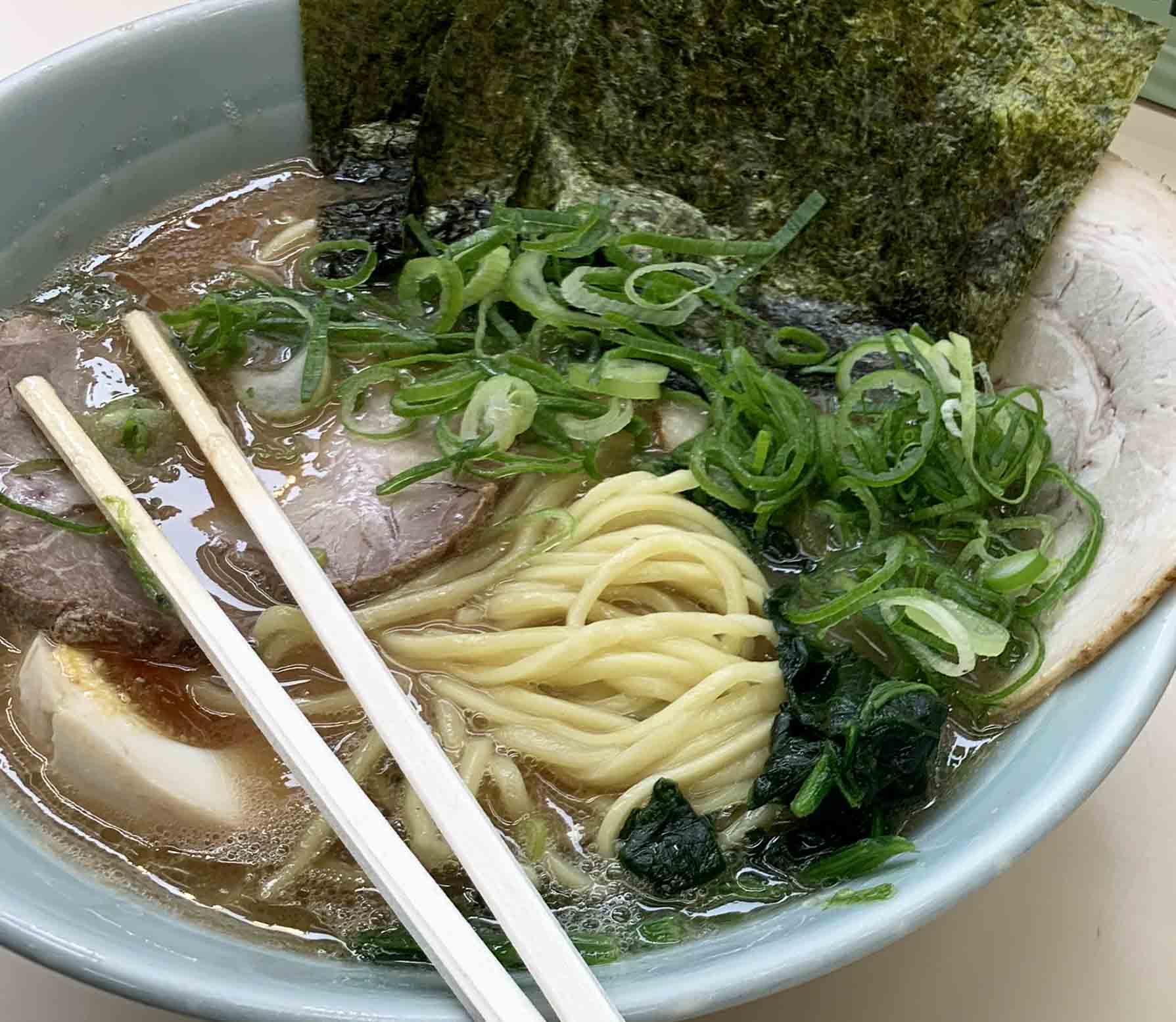 濃厚なとんこつ醤油ラーメン。家系のラーメンは、ほうれん草と海苔が入っているのが特徴であるらしい。とても美味しかった。 |