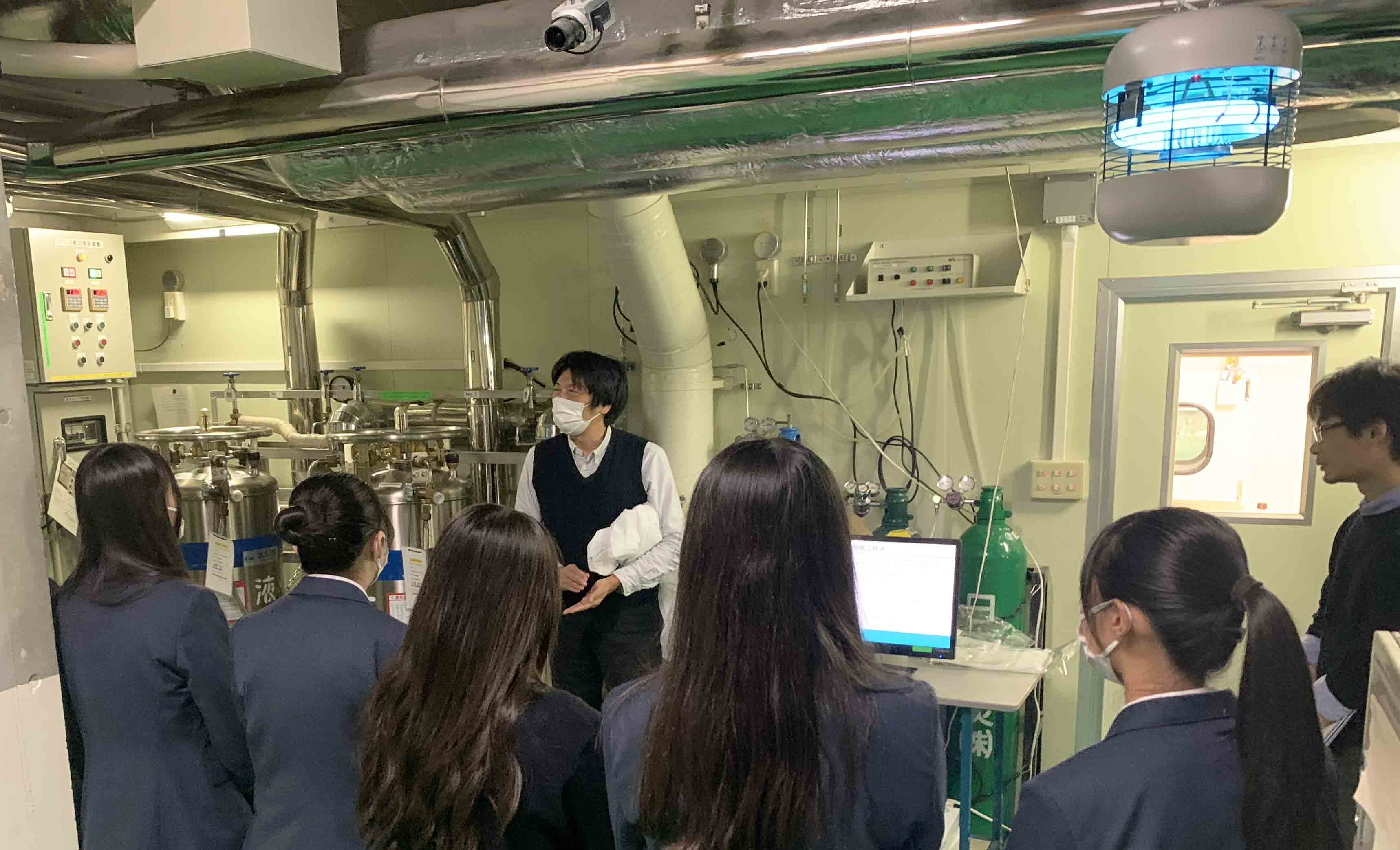 引率者は、河本研の3人(永野君、西村君、板原君)。見学コースの一つはうちの研究室で、セルソーター、インキュベーター、クリーンベンチなどを見てもらった。写真は西村君がセルソーターについて説明しているところ。 |