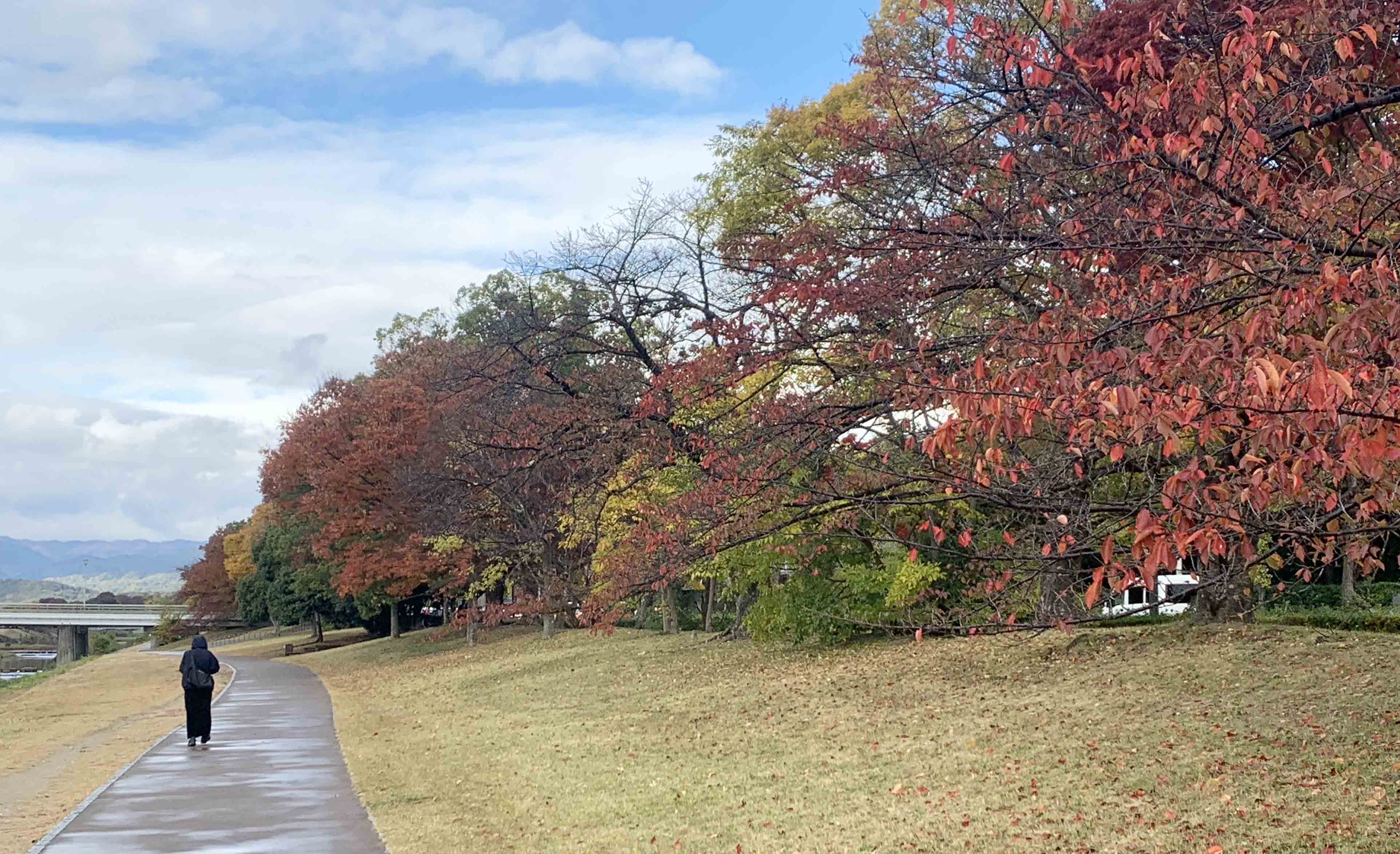 あるタクシーの運転手さんが「サクラは無料、モミジは有料」と言っていたが、確かにサクラはただで見られる名所が沢山あるが、モミジの名所の多くは、拝観料を払う必要がある。鴨川沿いには、サクラは沢山見られるが、モミジはあまり見られない。とはいえ、モミジがあまりなくても、十分きれいだ。なお、その運転手さんによると、今年の京都の名所のモミジは、全体的にイマイチだそうだ。 |