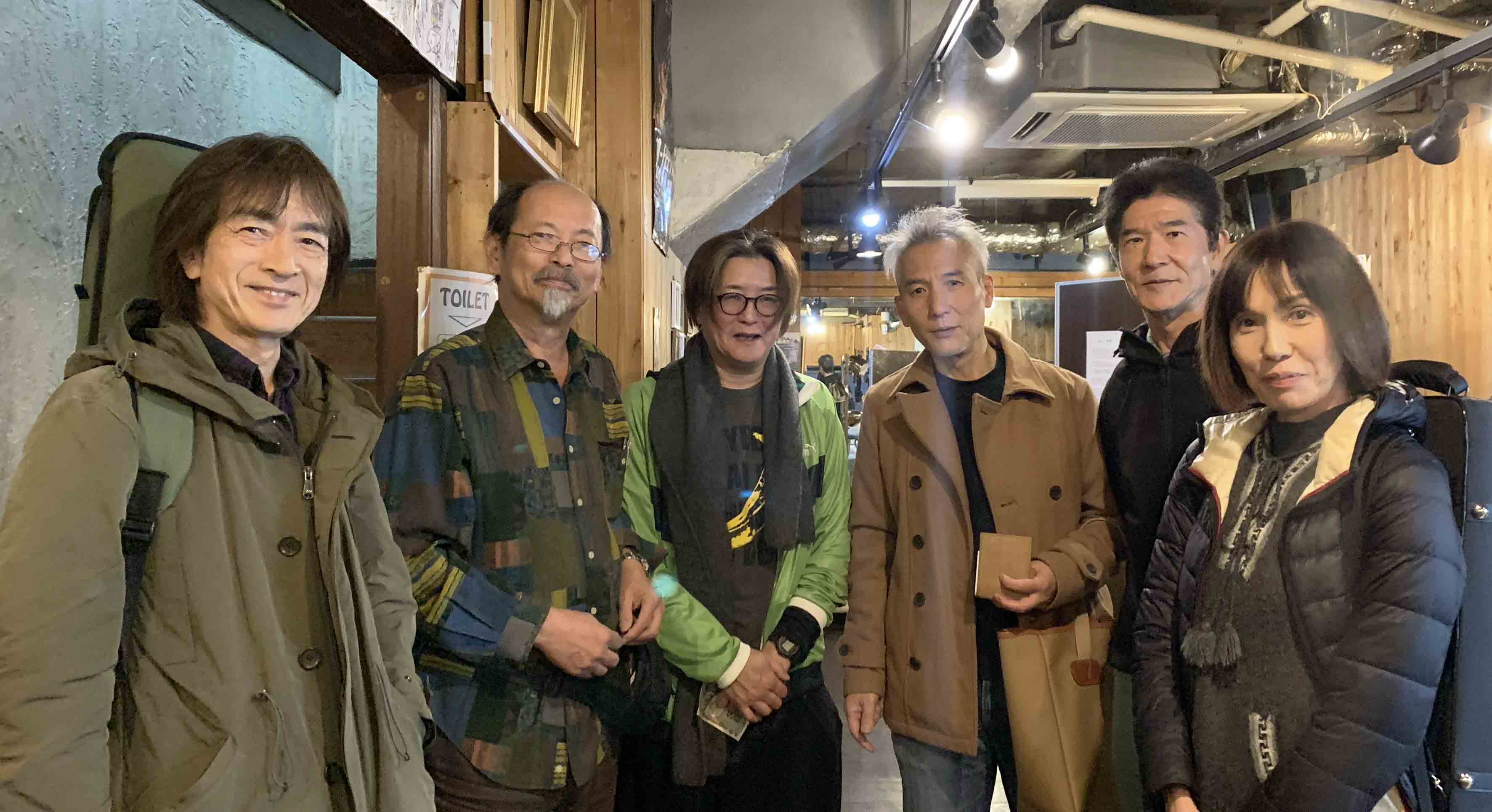 この日の午後、ネガティブセレクションの練習で河原町三条のRagというスタジオに行ったら、ちょうど高校の同級生らがやっているロックバンドとばったり出くわした。向かって右から3人目がリーダーの田中英雄氏で、かつては「R367ミヤコ・ロック・ショー」といういわゆるロックンロールのバンドを長らくやっていて、私はよく観に行っていた。何年か前に一旦解散になって、今のバンドは、確か「初心忘るべからず」という名前だったと思う。来年2月22日日曜日に西院のネガポジというライブハウスで、14時ごろからライブをやるそうだ。坂本氏(左端)と北野氏(右から二人目)が同級生。 |